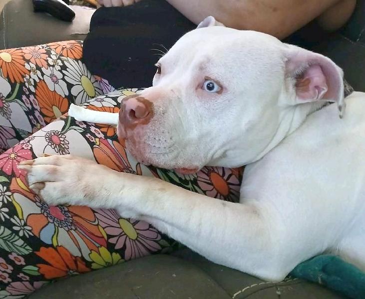 Notes: Eos is a 1 year old Pit/Husky mix, white with brown spots by his tail and smaller spots on ears. Left eye hazel, right eye blue. He is not neutered and it is unknown whether he has had any vaccinations.